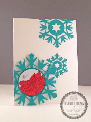 I simply printed off the file with the 3 labels and fussy cut them out. I then used my At You Spica Pens to colour the poinsettia in and the rim of the label. This is then layered onto the largest Designer Die Snowflake and adhered to the card using foam adhesive. The medium and small snowflake die cuts are adhered flat to the card. Below is a close up of the detail, it doesn't show how sparkly the poinsettia is though in the photo but it is there in real life.
