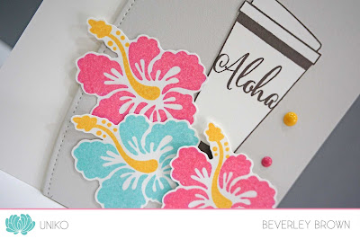 Uniko has recently released two NEW clear stamp sets, Paradise and Paradise leaves. So, I thought I'd combine the hibiscus flower with the coffee cup from I LOVE Coffee. The Aloha sentiment fit perfectly inside the cup too ;)